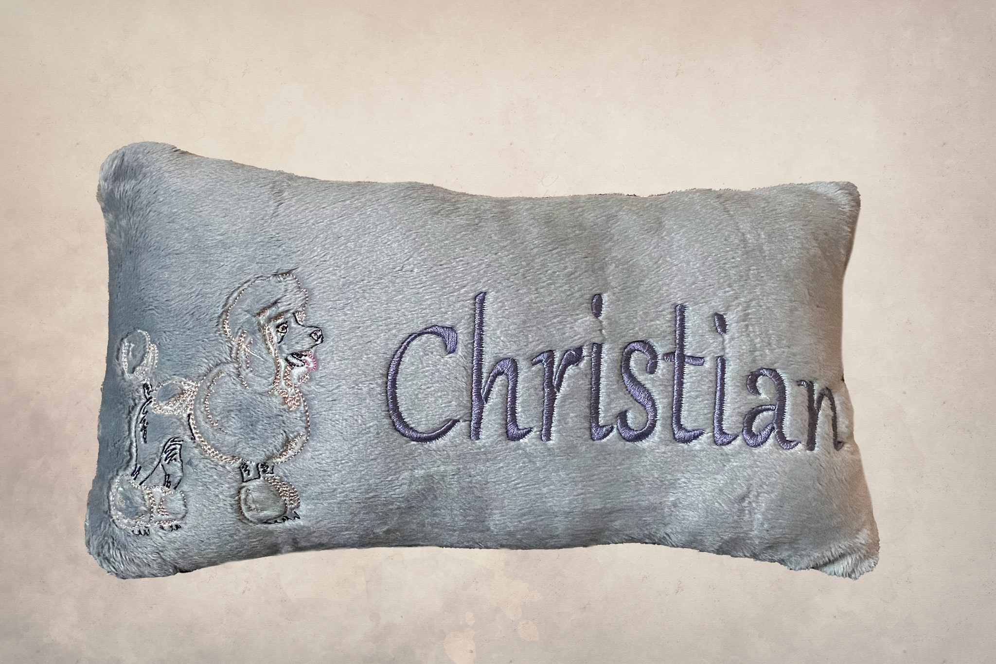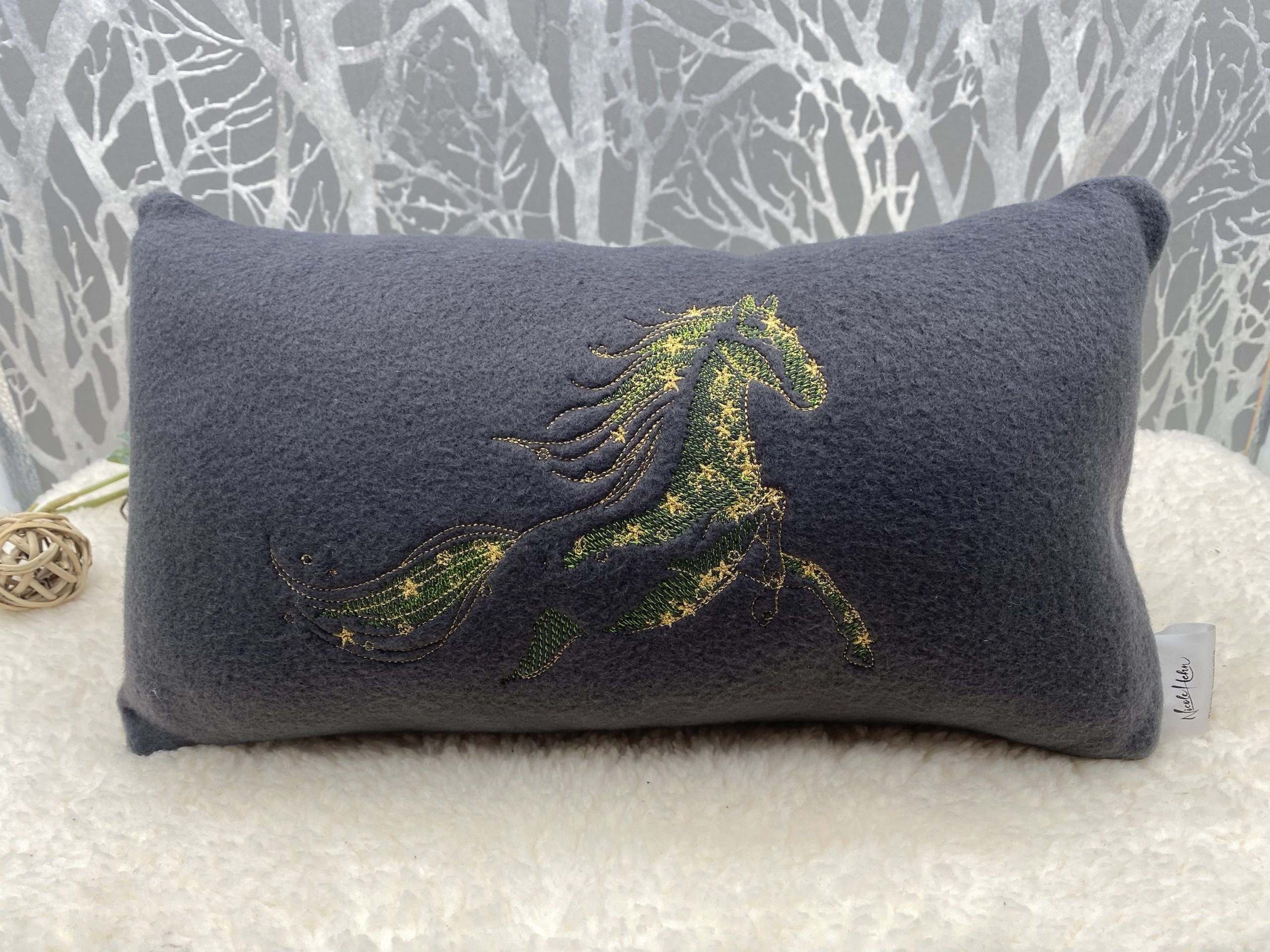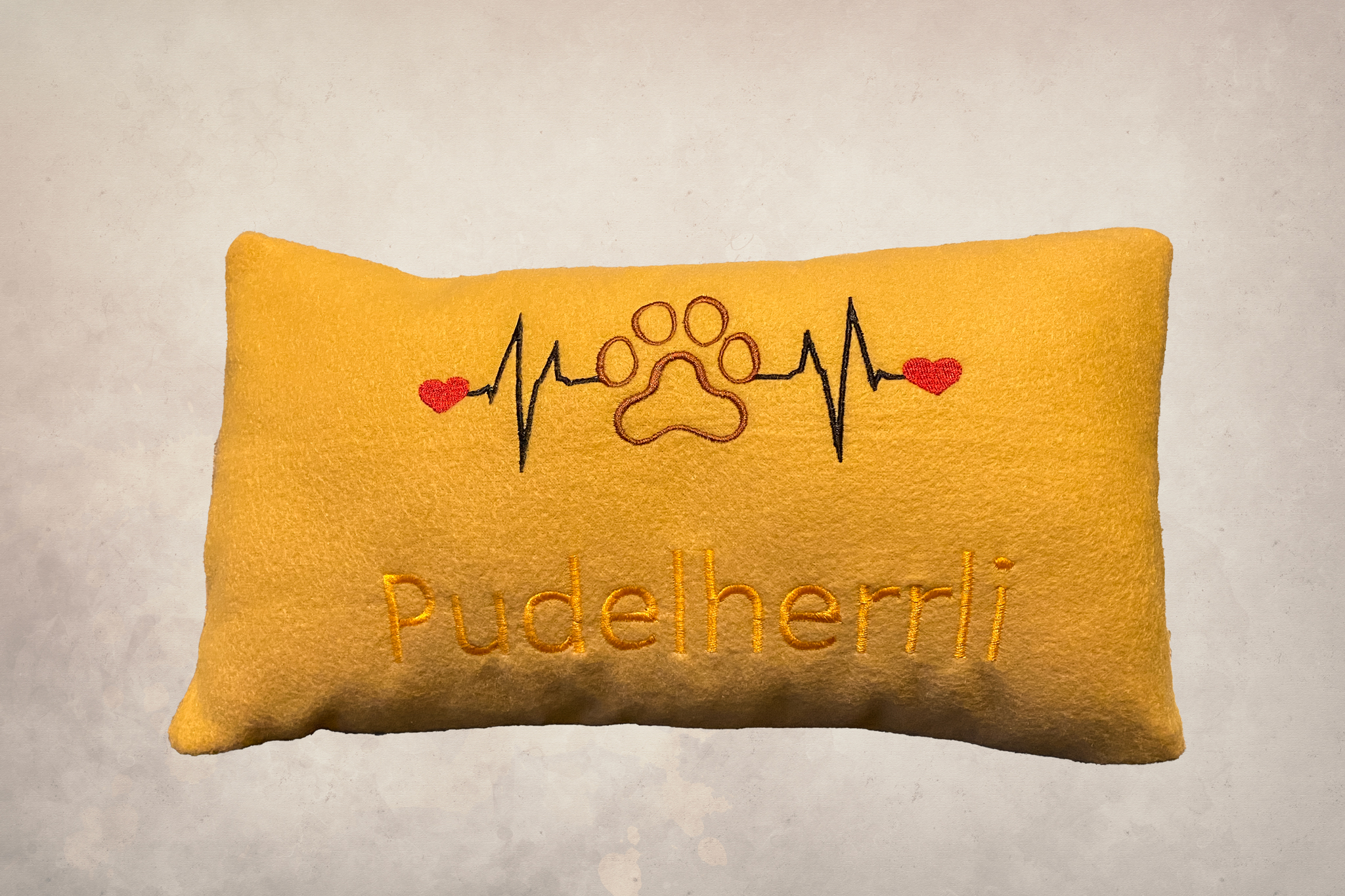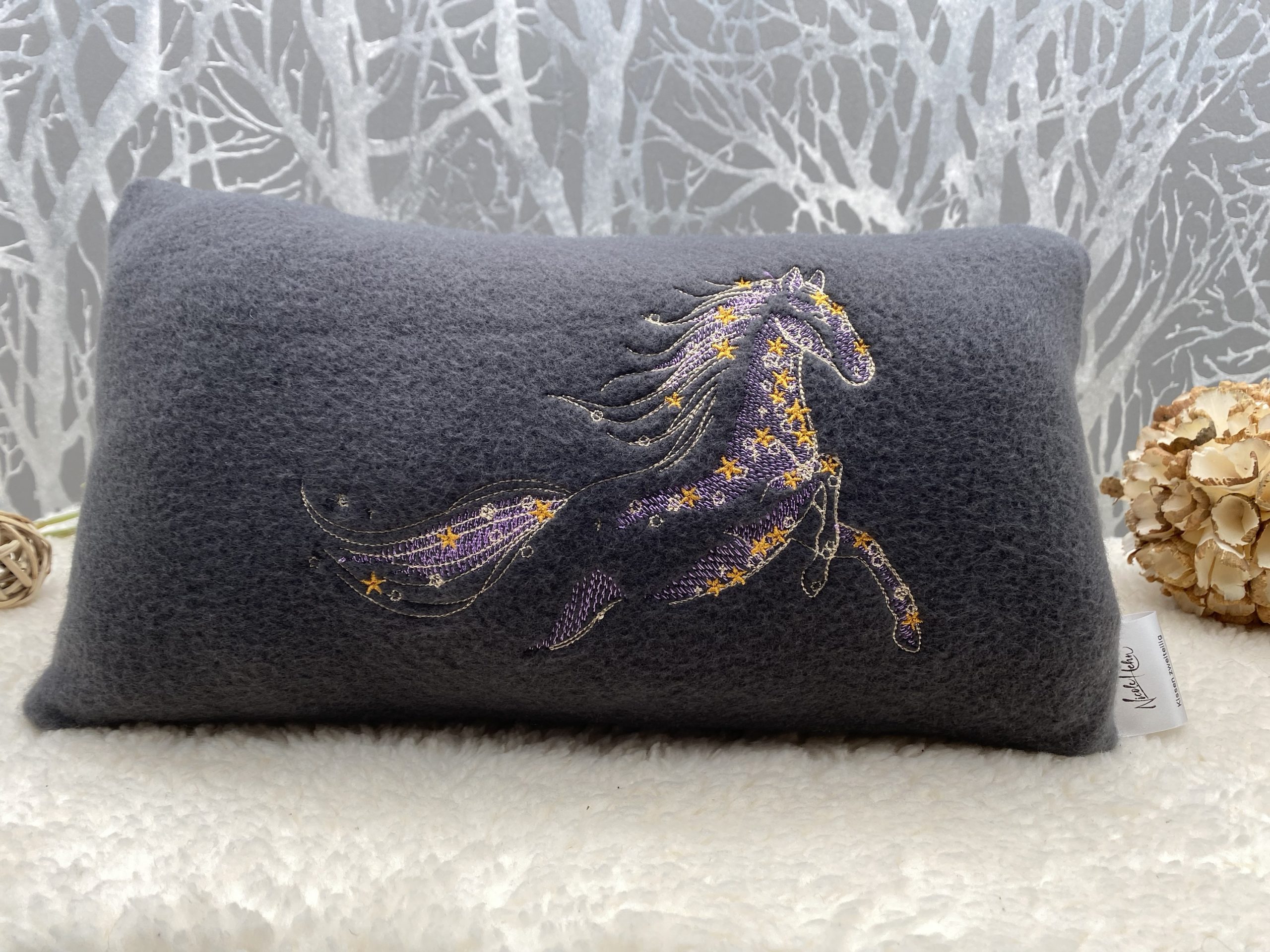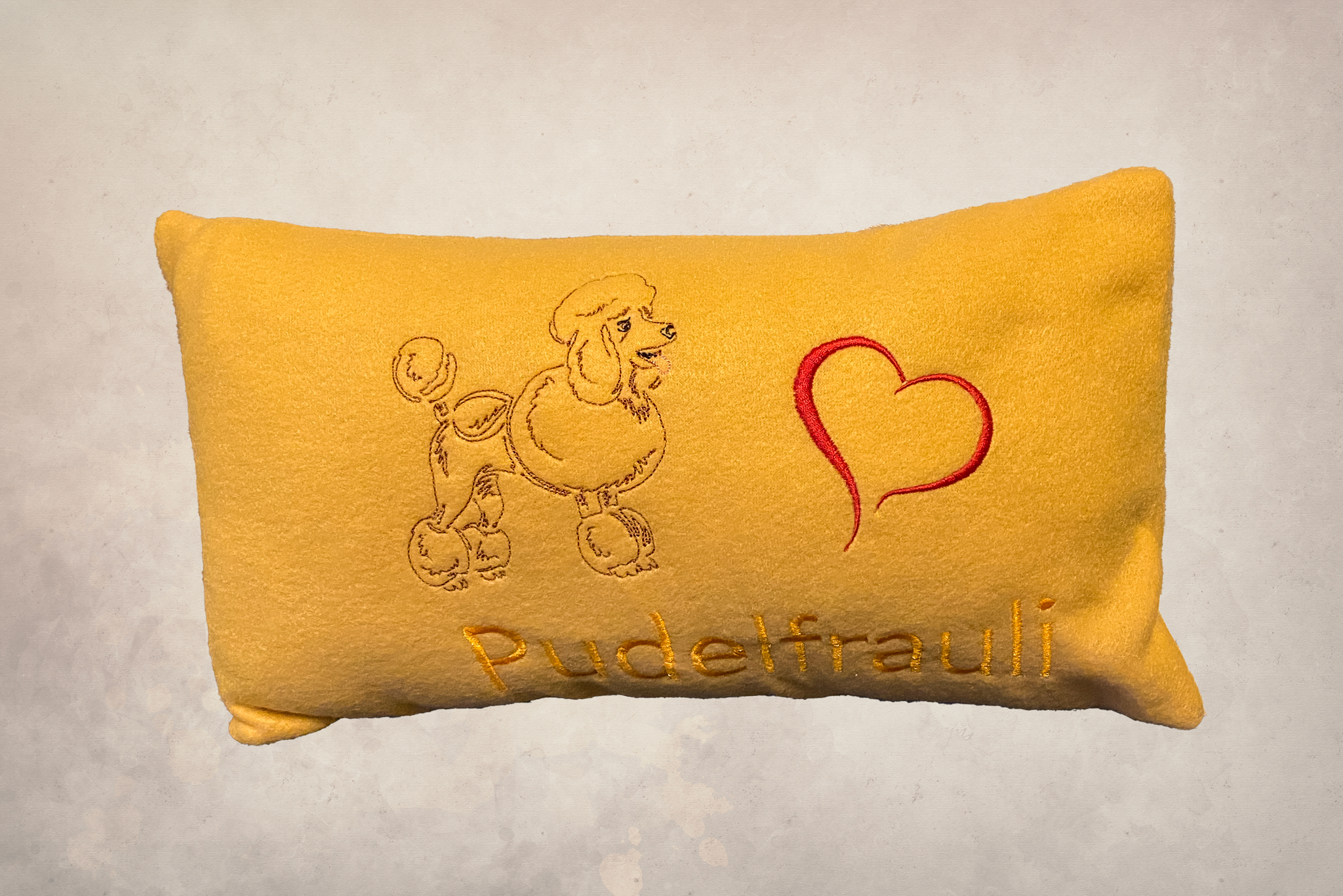 Außerdem kann ich die Vorderseite mit einem Motiv / Thema eurer Wahl besticken. Gerne auch mit einem Schriftzug. (Der Pudel im Beispielbild stammt von Zauberstiche – Sigrid Beham, der Fuchs ist von Stickwolke, das Sternenpferd von Urban Threads).